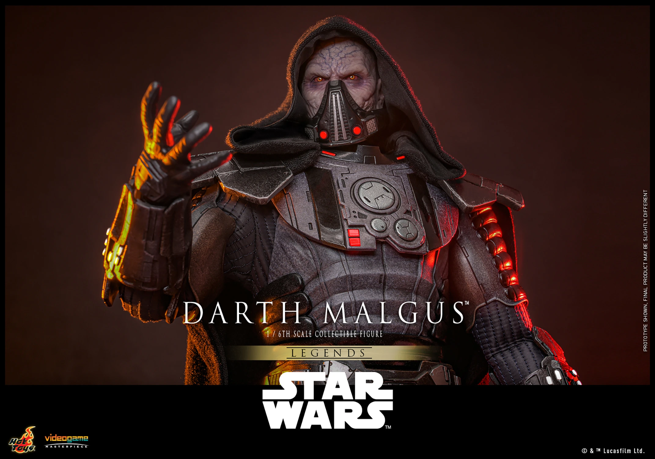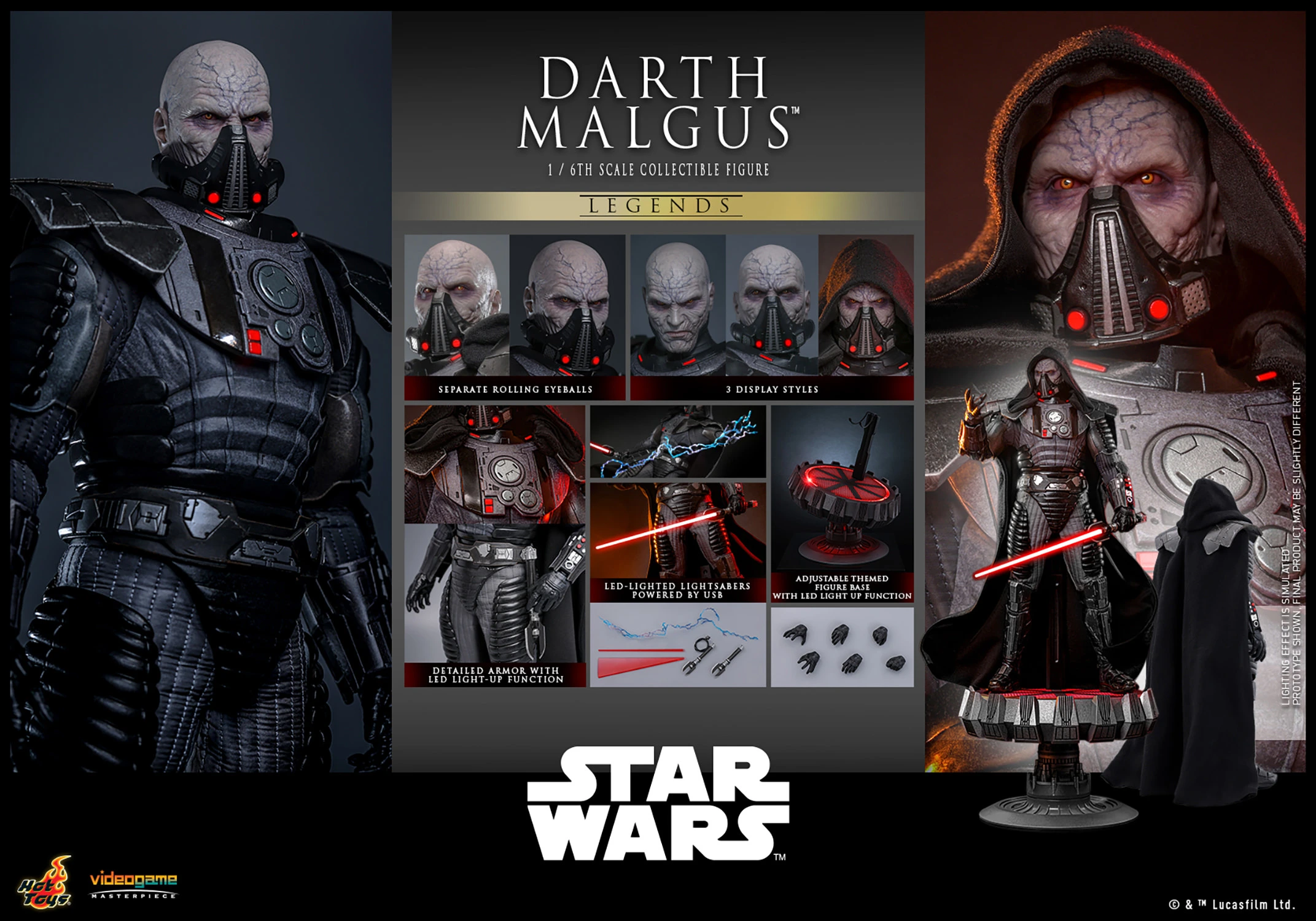 Con 34 cm de altura y más de 30 puntos de articulación, Darth Malgus viene con su icónica armadura negra con luces LED en los guanteletes y el pecho, capa de tela real y casco desmontable iluminado. Su sable de luz rojo cuenta con versión estática e intercambiable en movimiento, acompañado de un efecto de rayos de la Fuerza y una base circular iluminada.