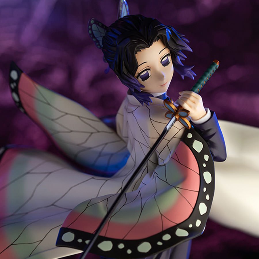 Con una escultura refinada y una pose llena de movimiento, la figura muestra a Shinobu sosteniendo su Nichirin Blade mientras su haori se eleva con gracia, recreando la ligereza de su estilo de combate. La base está decorada con un motivo de mariposas flotantes, evocando su respiración de Insecto y su serenidad característica.