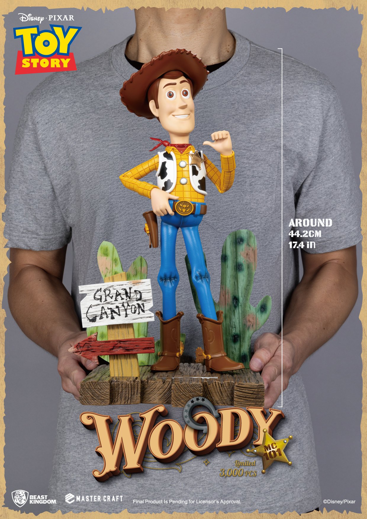 El Sheriff Woody cobra vida con un nivel de detalle excepcional: desde la textura del cuero en sus botas hasta el brillo metálico de su placa. Cada pliegue de su camisa, chaleco y cinturón ha sido recreado con técnicas avanzadas de escultura 3D y pintura por capas, logrando un realismo sorprendente.