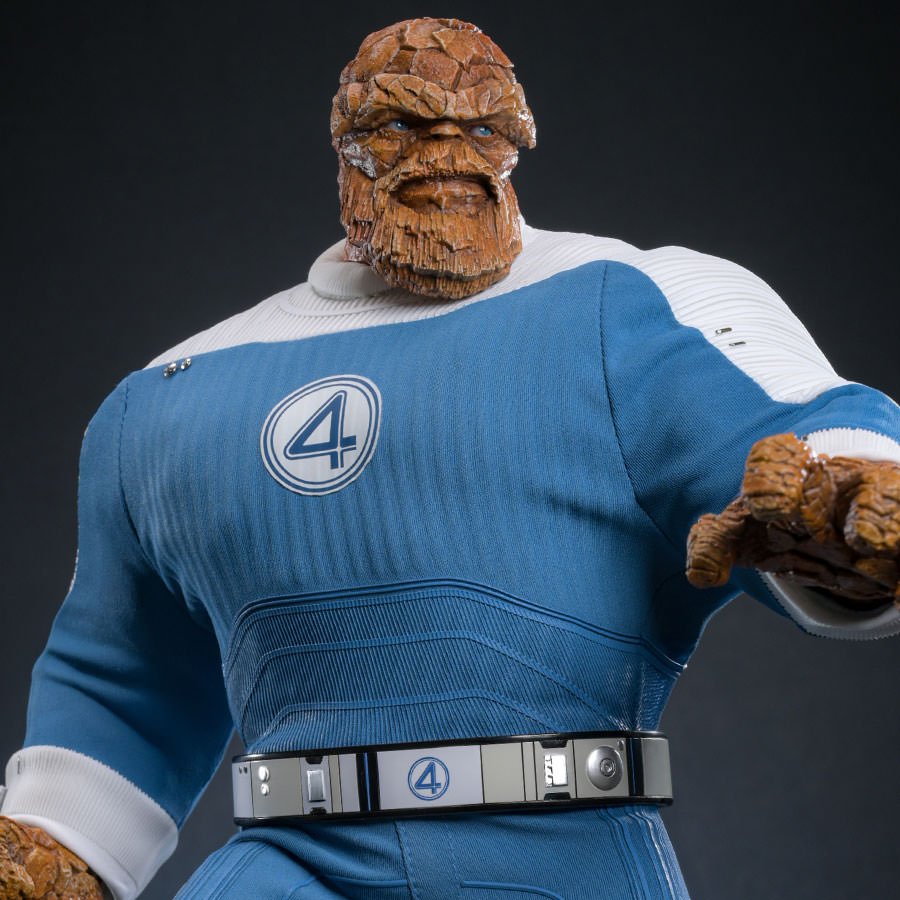 La figura de The Thing a escala 1:6 presenta un cuerpo rocoso texturizado con más de 15 puntos de articulación, dos cabezas intercambiables con ojos móviles (una normal y otra con barba) y un traje clásico de los Fantastic Four confeccionado en tela elástica azul y blanca.